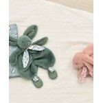 Ce doudou lapin vert au minois attendrissant est d'une forme généreuse et allongée, ce qui le rend agréable à câliner. Son poil soyeux et doux au toucher est un véritable atout pour le bien-être de bébé.