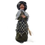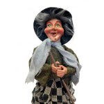Sorcière debout à poser, visage amical avec pieds plastique. Elle est vétue d'une robe à carreaux.
