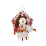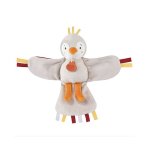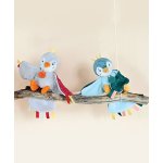 "Secoue-moi pour m'entendre chanter … CUI CUI !" Voici un chouette Doudou oiseau niché dans une jolie boîte cadeau fleurie très originale en forme de nichoir. En matière très douce majoritairement un blanc et gris côté face, côté pile c'est un jersey rouge terracotta au motif végétal que l'on découvre. Les extrémités de ses ailes et de sa queue très souples ainsi que le sommet de sa tête sont garnis de petites étiquettes de couleurs, autant de détails à attraper et machouiller pour bébé. Très facile à manipuler et amusant avec son " cui cui" à volonté dès qu'on le secoue, ce Doudou oisillon est un cadeau parfait dès la naissance.