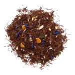 Rooibos aromatisé à l'orange, à la fraise et à la framboise, parsemé de morceaux de noix de coco, de framboises, d'écorces d'orange et de pétales de bleuet.