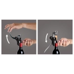 Après avoir retiré la capsule en aluminium de la bouteille de vin, placez le tire-bouchon sur la bouteille de vin en faisant glisser la partie inférieure avec les poignées en caoutchouc sur le dessus. Saisissez fermement les bras pour les maintenir en place et rabattez le levier vers le bas pour le visser dans le bouchon de liège. Rabattez ensuite le levier vers le haut pour retirer le bouchon de vin.