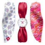 Les ailes du Moulin Rouge tournent au centre du cadran comme pour scander le rythme endiablé du French Cancan, qui a inspiré un design affirmé et plein de peps pour les 3 bracelets en satin interchangeables.